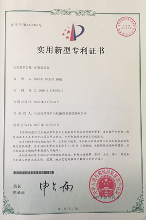 我公司礦用裝藥器新獲得國家專利證書